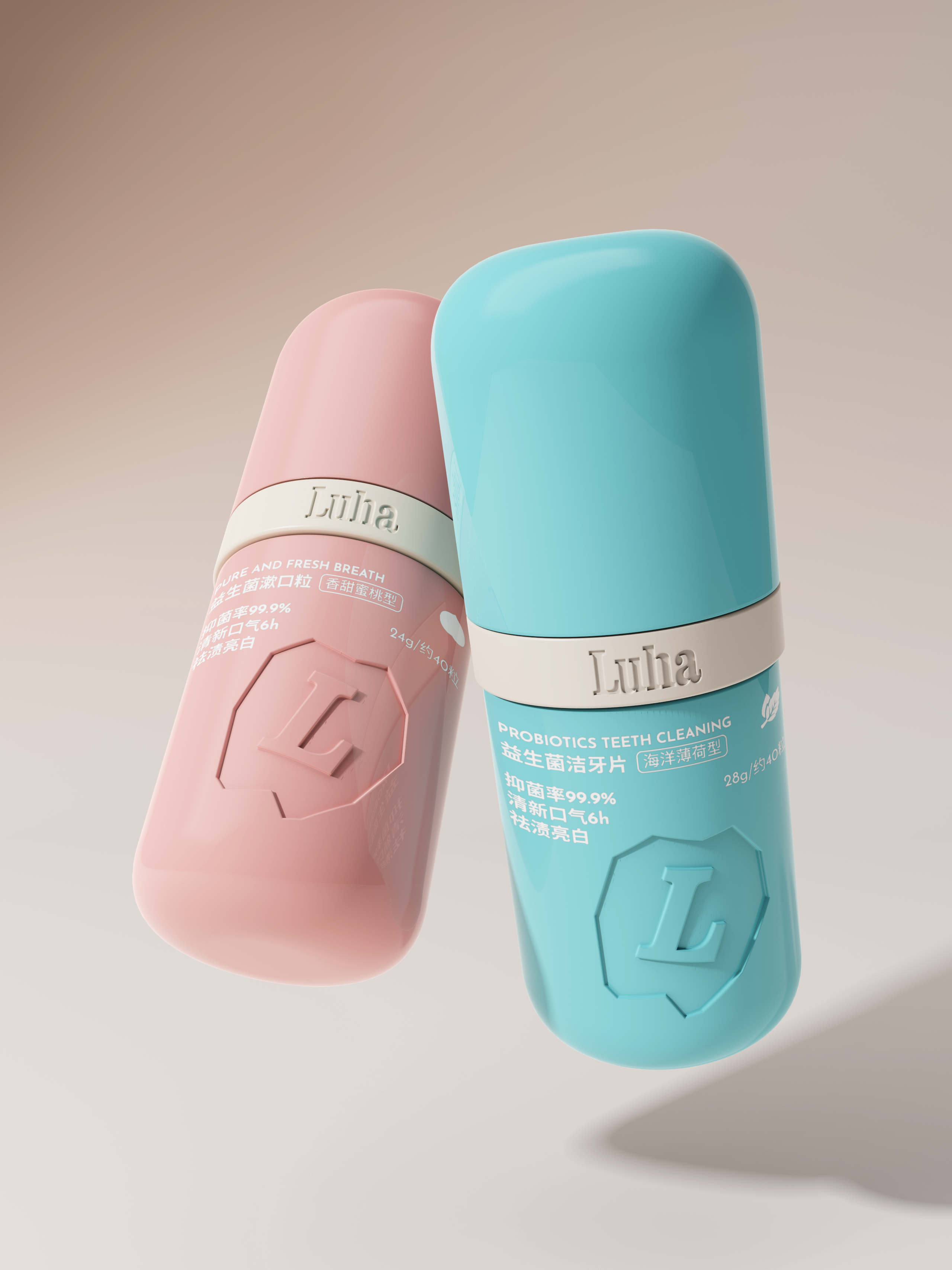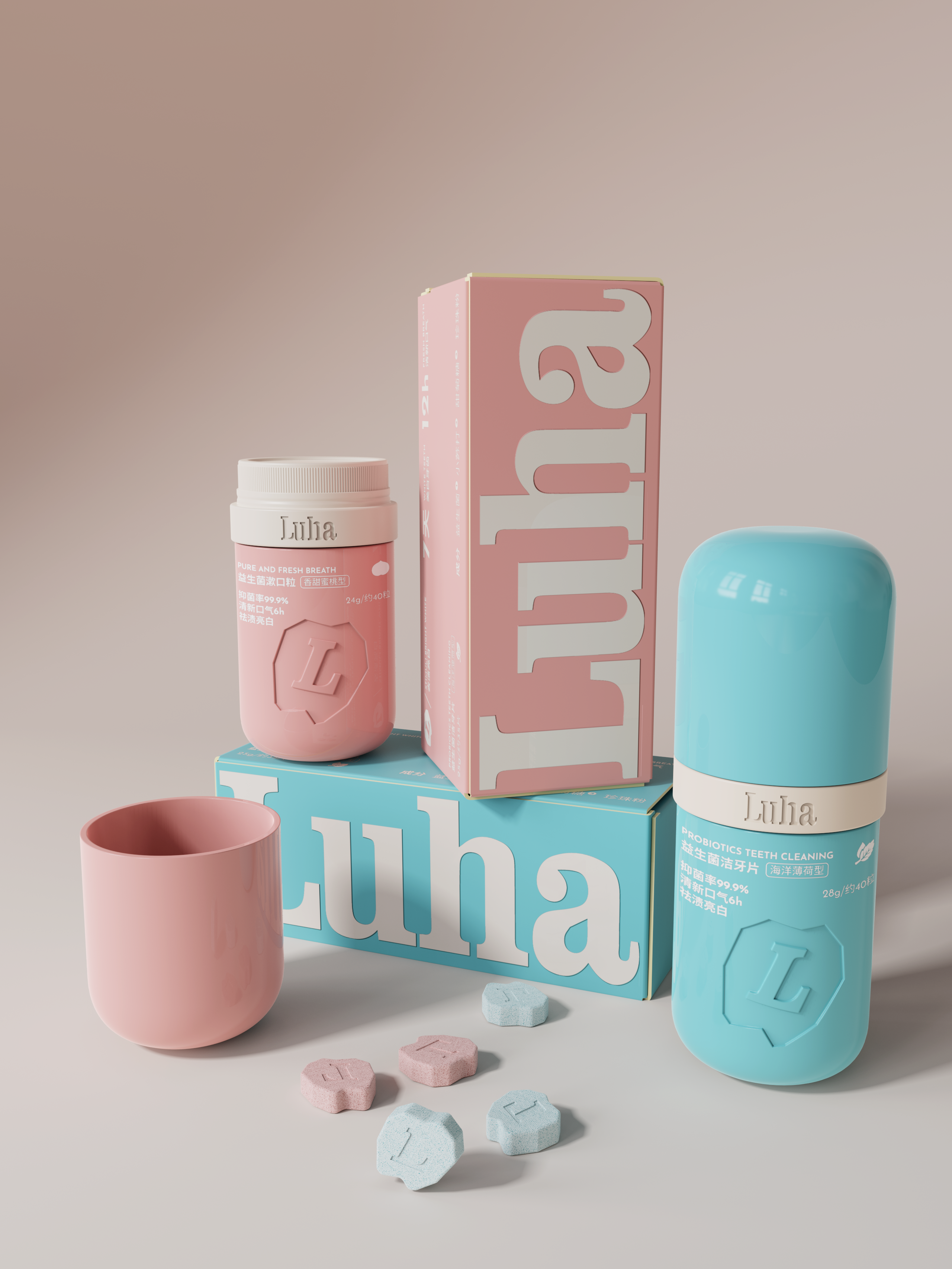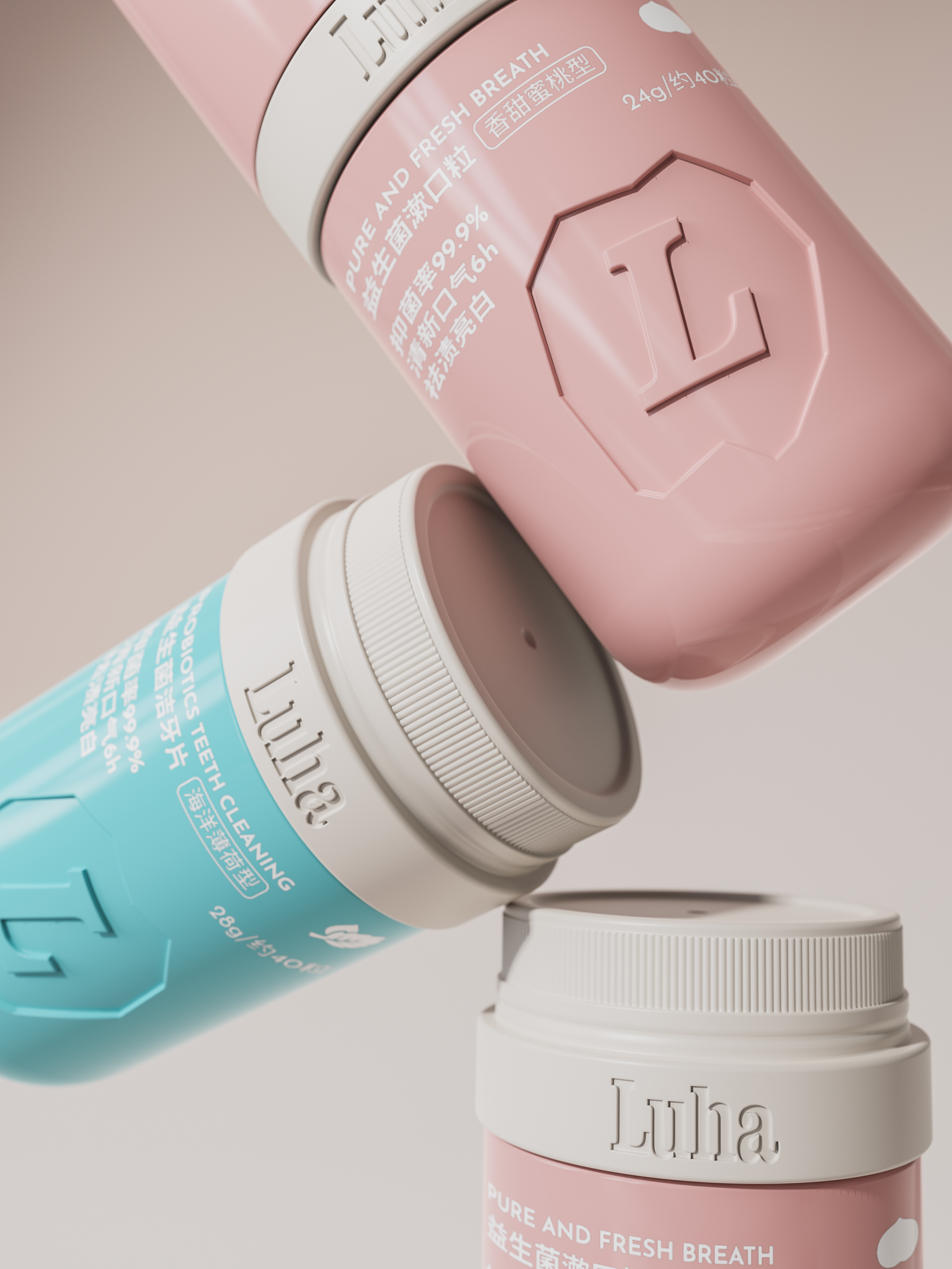 Luha号称喺75%口腔盲区嘅清洁师,所以响我哋做设计嘅开头,首先谂紧嘅喺要点样将佢份功效嚟做视觉化表达。咁我哋就将个logo擘大嚟打造一个年轻化嘅品牌标识形象,并拣咗衬线体嚟丰富字体嘅细节,仲将呢样嘢抌落瓶身同埋洁牙片上。同时,我哋将瓶身搞成个“胶囊”款,咁就易于携带,而个瓶嘅上中下三段式结构,分别喺上盖装水、中盖连住上盖同瓶身,以及装住洁牙片嘅瓶身,咁成个设计就好分工明确,搦惜便携。共同打造一个既有款能解决口腔健康问题嘅专业形象同时,又劲受后生消费者锺意嘅品牌。 Luha claims to be a cleaner for 75% of the blind areas in the mouth, so when we started designing, our first idea was how to visually express the effectiveness of bowel movements. We enlarged the font of the logo to create a youthful brand image, and used suitable lines to enrich the details of the font. We also further integrated it into the bottle body and teeth cleaning tablets. At the same time, we have designed the bottle body in the shape of a "plastic bag" for easy carrying, and the three section structure of the bottle, namely the upper lid for water, the middle lid for connecting the lid and the bottle body, and the bottle body for cleaning teeth, has clear division of labor and is compact and convenient. To jointly create a brand with a professional image that can solve oral health problems and is very popular among young consumers.