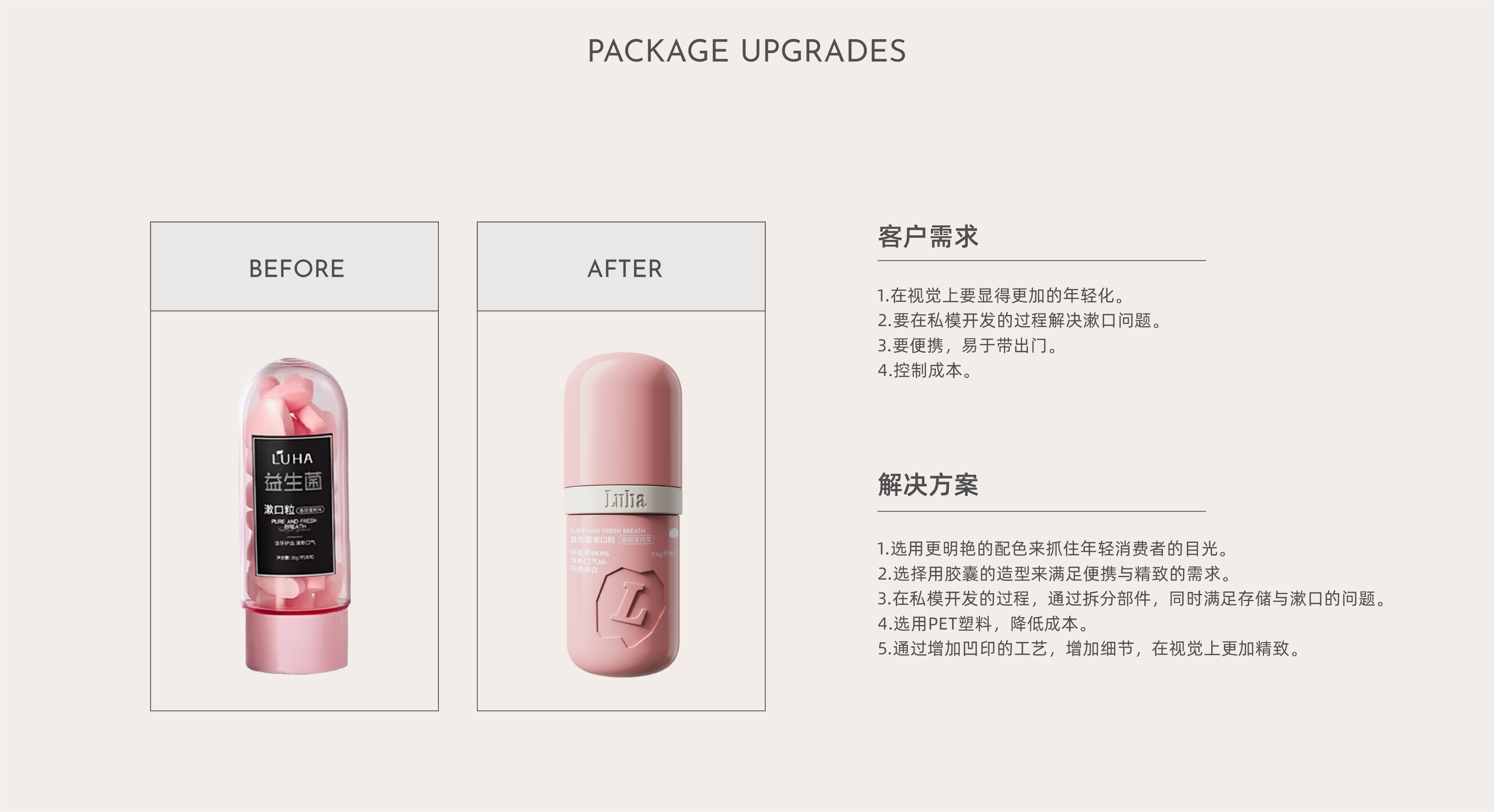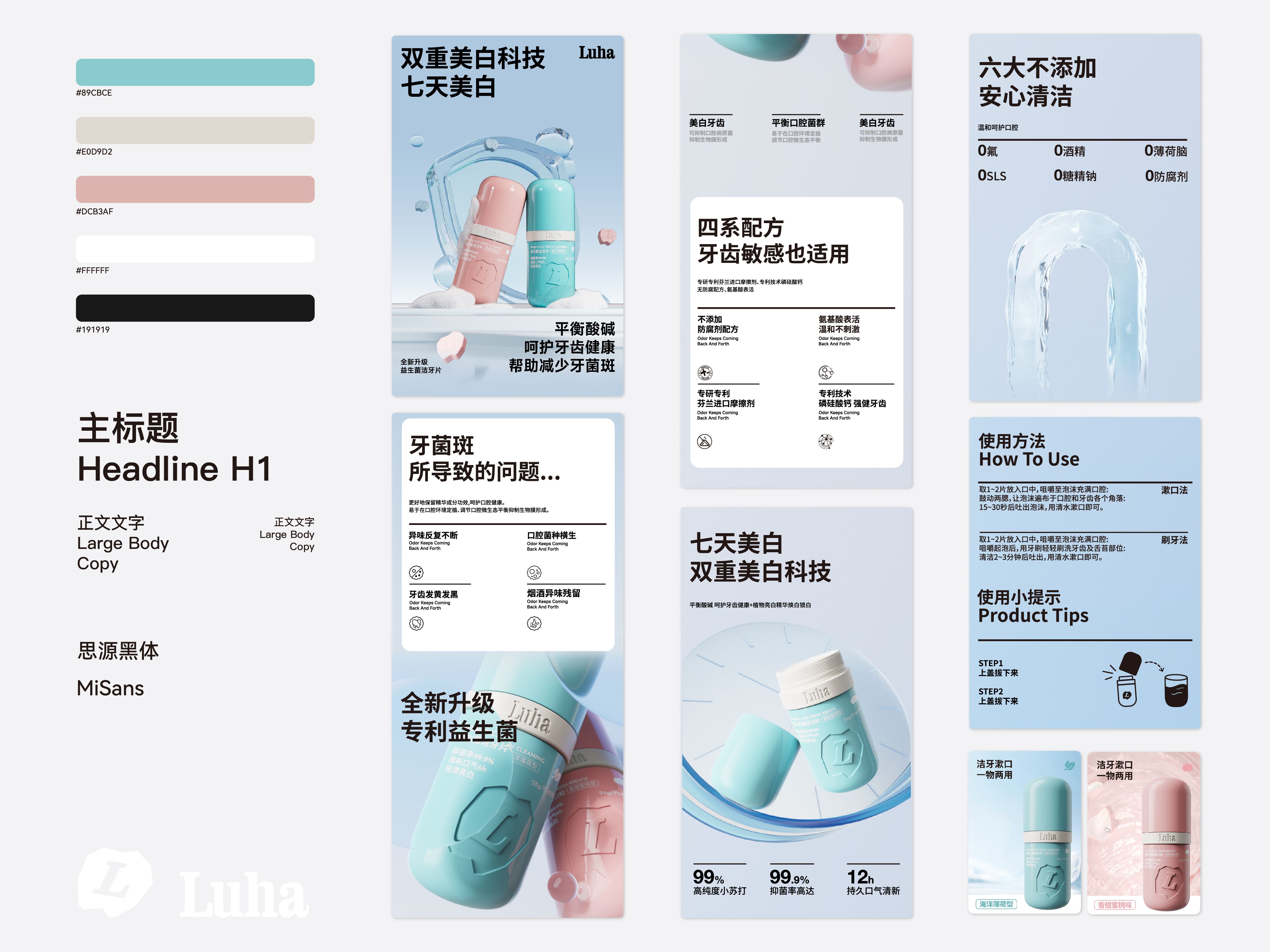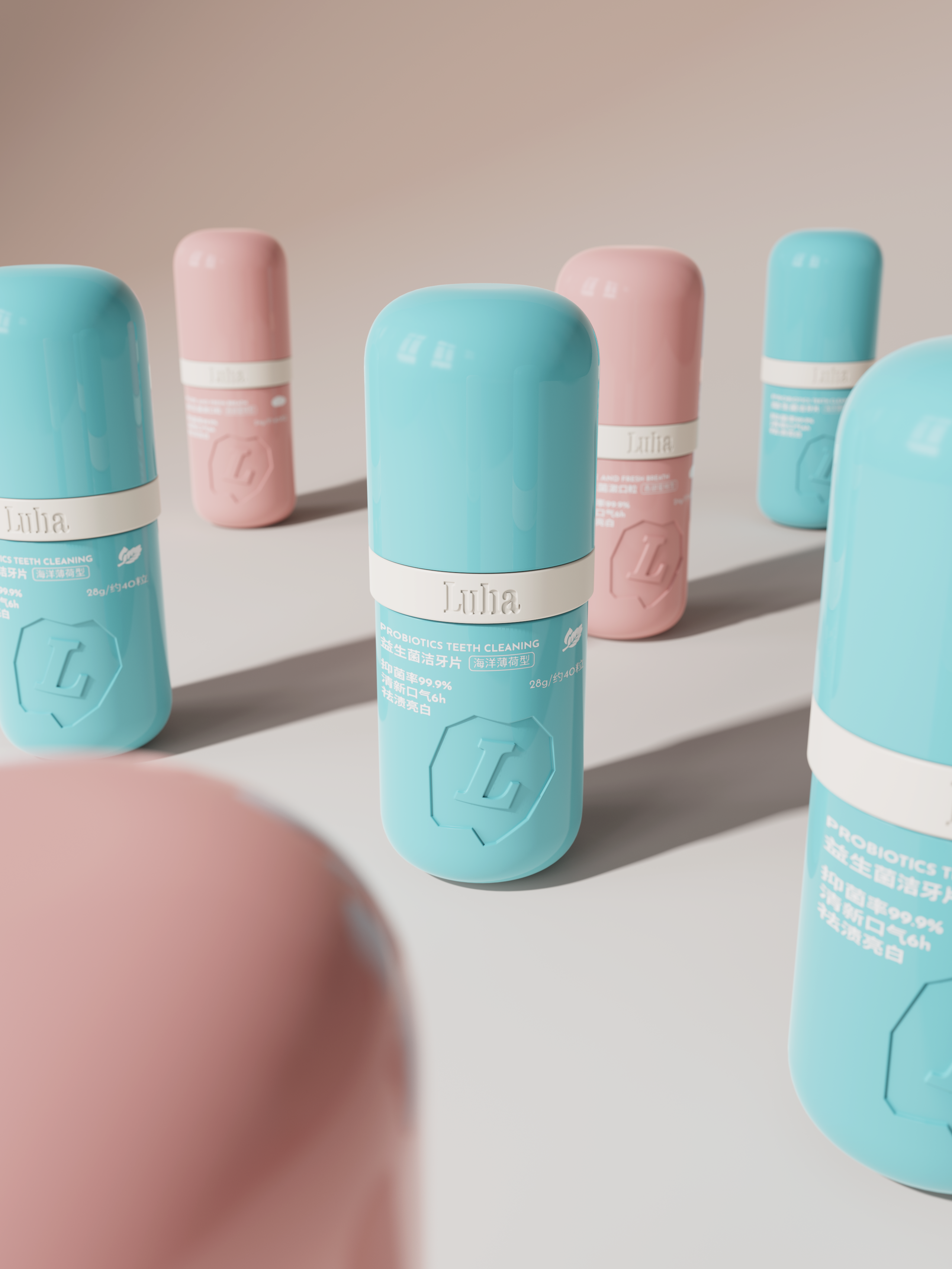 Luha号称喺75%口腔盲区嘅清洁师,所以响我哋做设计嘅开头,首先谂紧嘅喺要点样将佢份功效嚟做视觉化表达。咁我哋就将个logo擘大嚟打造一个年轻化嘅品牌标识形象,并拣咗衬线体嚟丰富字体嘅细节,仲将呢样嘢抌落瓶身同埋洁牙片上。同时,我哋将瓶身搞成个“胶囊”款,咁就易于携带,而个瓶嘅上中下三段式结构,分别喺上盖装水、中盖连住上盖同瓶身,以及装住洁牙片嘅瓶身,咁成个设计就好分工明确,搦惜便携。共同打造一个既有款能解决口腔健康问题嘅专业形象同时,又劲受后生消费者锺意嘅品牌。 Luha claims to be a cleaner for 75% of the blind areas in the mouth, so when we started designing, our first idea was how to visually express the effectiveness of bowel movements. We enlarged the font of the logo to create a youthful brand image, and used suitable lines to enrich the details of the font. We also further integrated it into the bottle body and teeth cleaning tablets. At the same time, we have designed the bottle body in the shape of a "plastic bag" for easy carrying, and the three section structure of the bottle, namely the upper lid for water, the middle lid for connecting the lid and the bottle body, and the bottle body for cleaning teeth, has clear division of labor and is compact and convenient. To jointly create a brand with a professional image that can solve oral health problems and is very popular among young consumers.