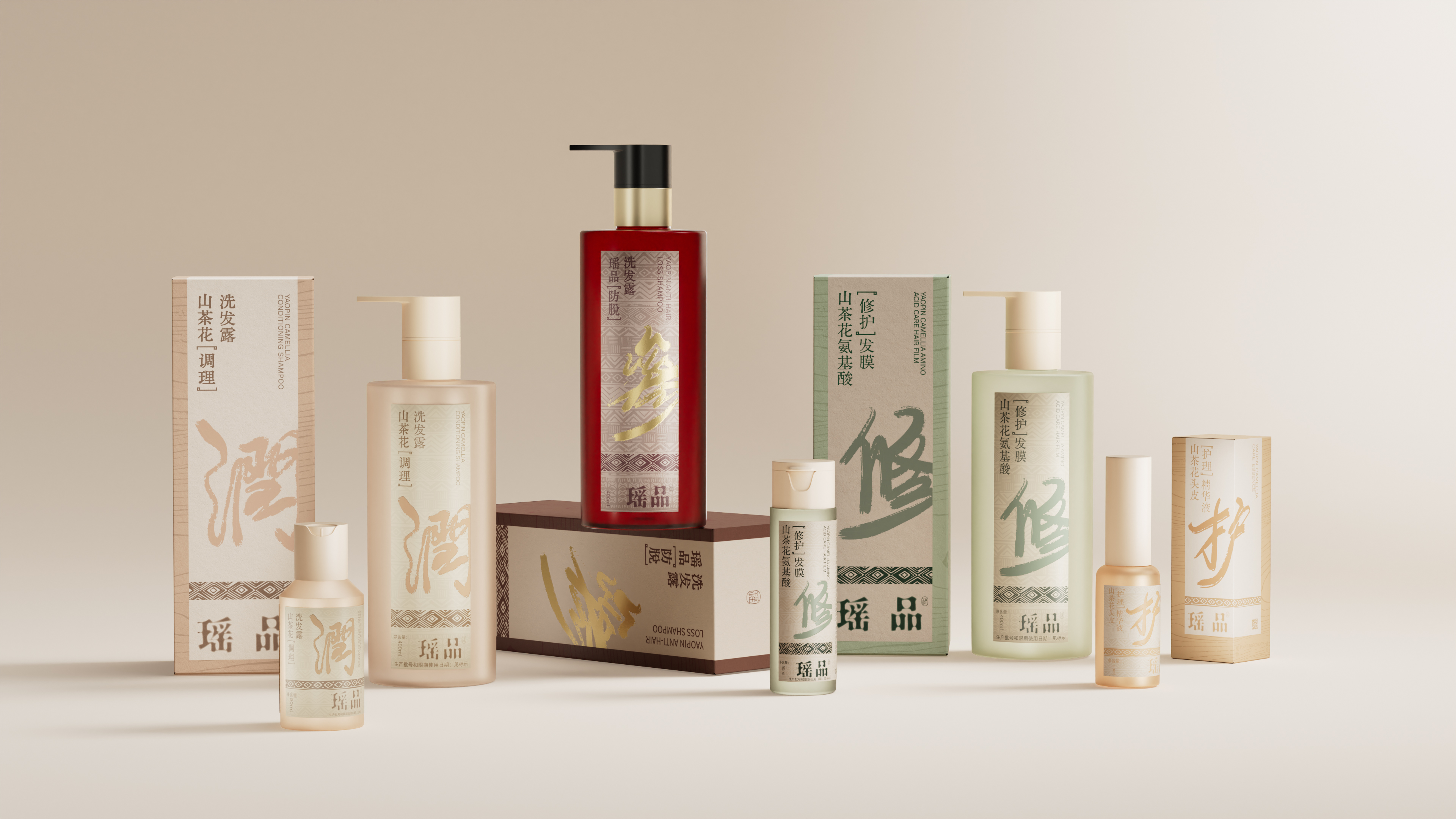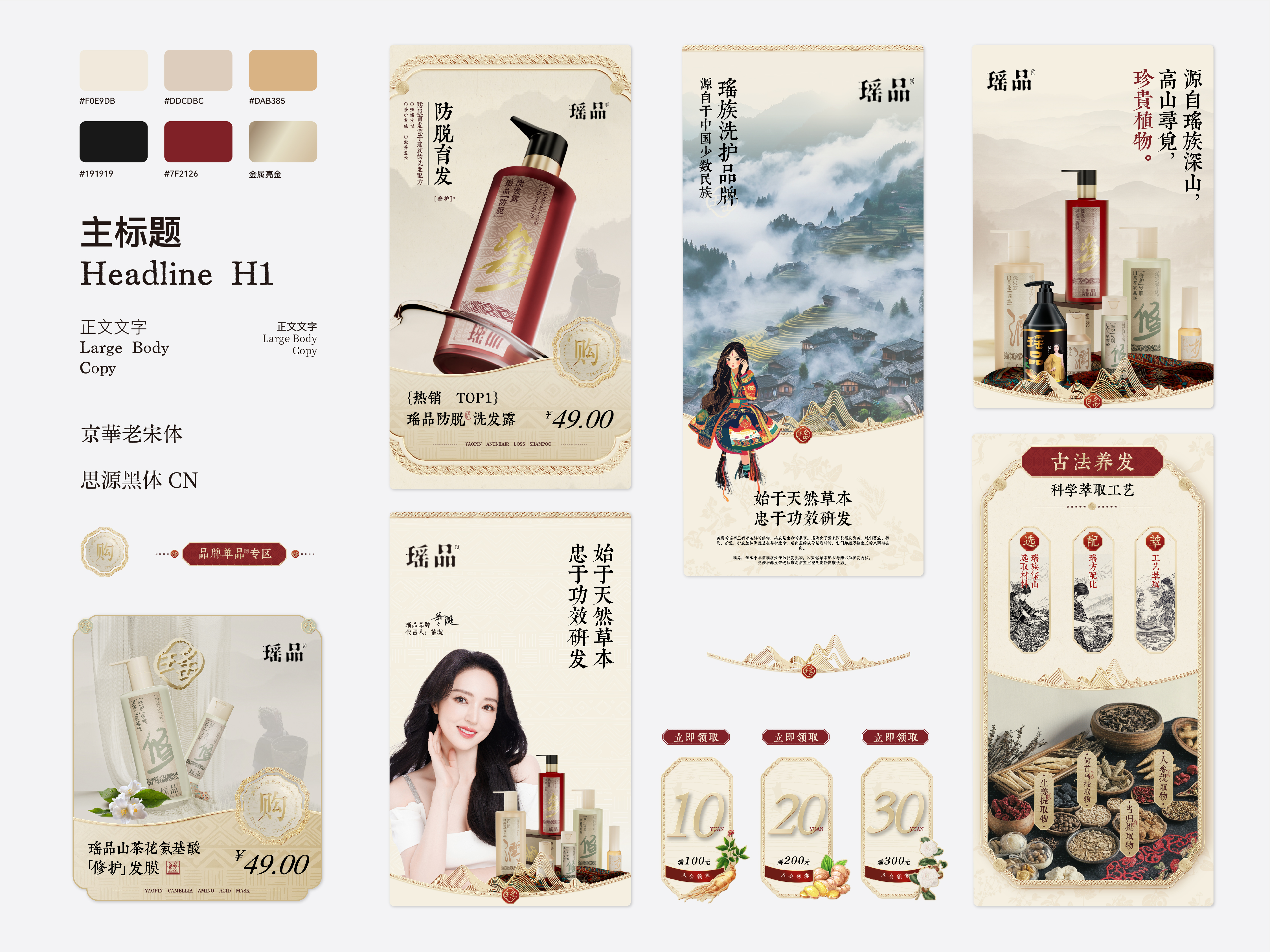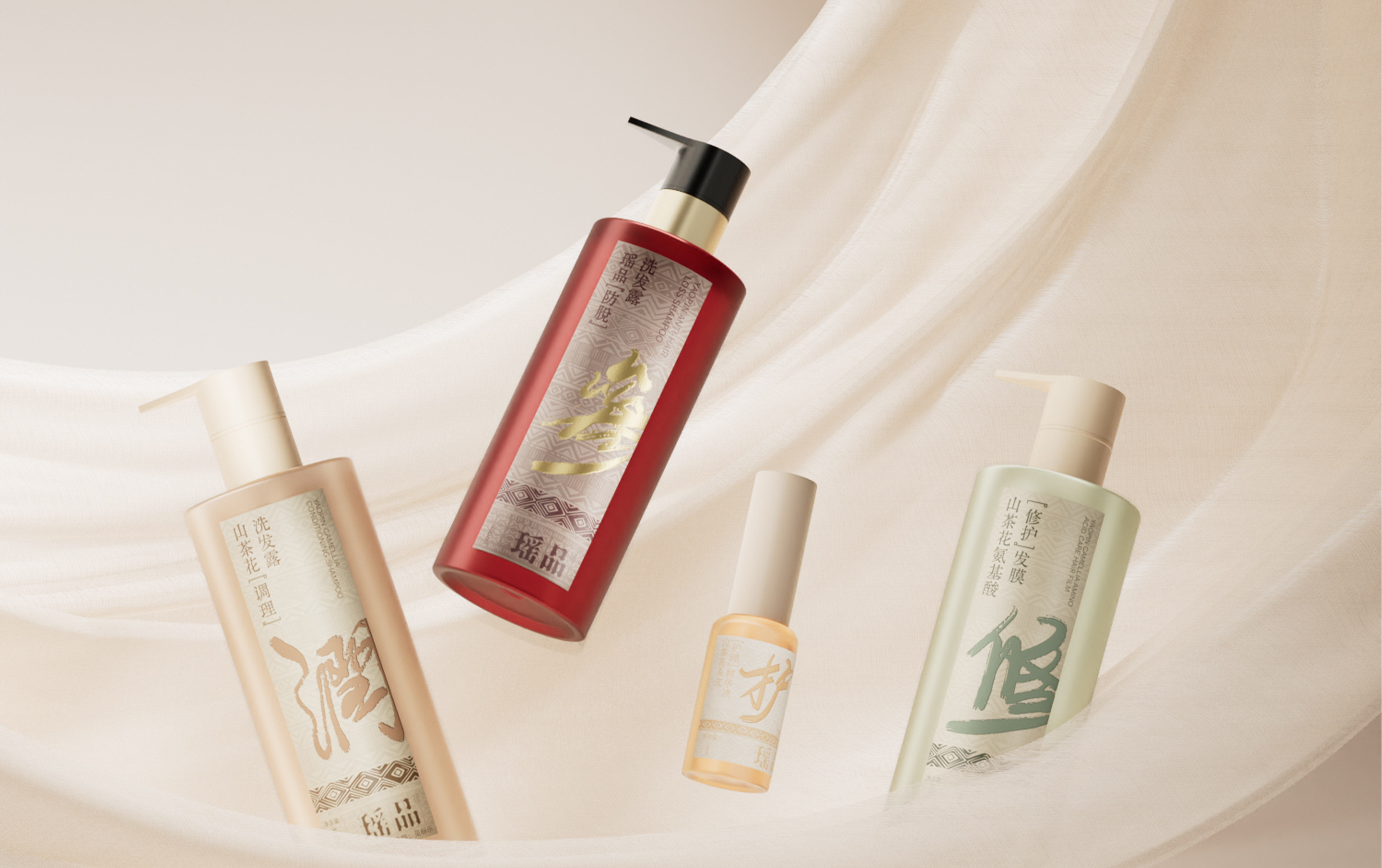 瑶品传承自从千年前流传至今嘅瑶族女子养发奥秘,利用天然嘅草本配方同埋浸药护发嘅谂法,嚟为消费者重塑头皮亚健康嘅状态。我哋响瑶族嘅民族特色同草本药方入面拎出祲古朴嘅韵味,再由设计师亲手写低嘅书法字体配合啲药材配色,嚟区分唔同嘅产品线,跟住提炼自得瑶綉先有嘅盘王组合纹路,夹埋响个瘦蜢瘦长嘅细面贴标,带畀消费者一股秀致又古雅嘅气息,同时亦都带畀市场一道嚟自大山瑶里嘅徐风。 YAOPIN inherits the mystery for hair care by the women of Yao nationality form thousands of years ago, using natural herbal formulas and medicinal bath hair care to reshape the sub-health state of the scalp for consumers. We have absorbed its ethnic characteristics and the ancient charm of herbal prescriptions, using handwritten calligraphy fonts and medicinal color schemes by designers to distinguish different product lines. Combined with composite graphics extracted from the unique combination pattern of the king Pan from Yao nationality embroidery, combined with long and small area labeling, we present consumers with a beautiful and elegant atmosphere, and also bring a gentle breeze from the Yao culture in the mountains to the market.