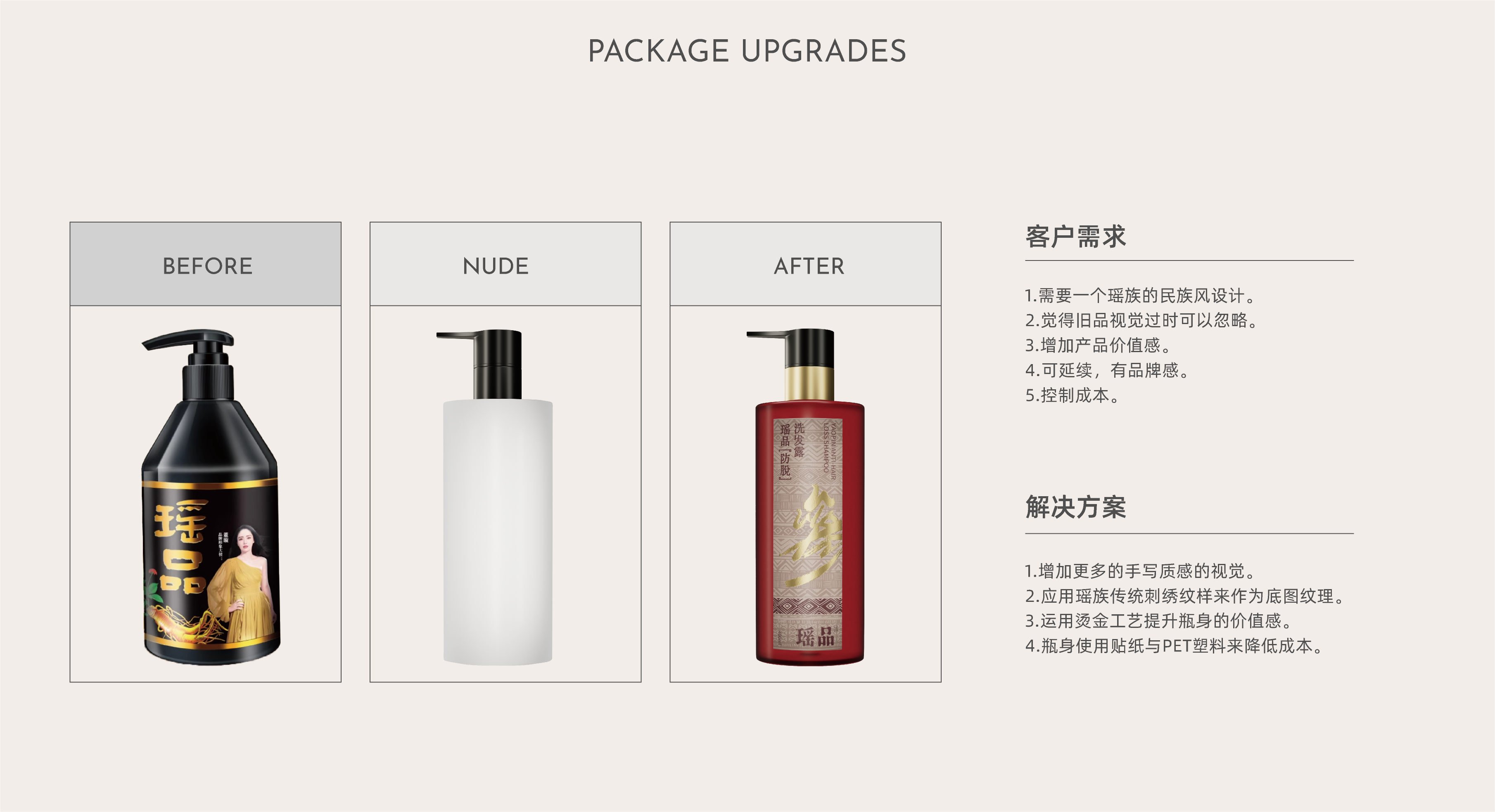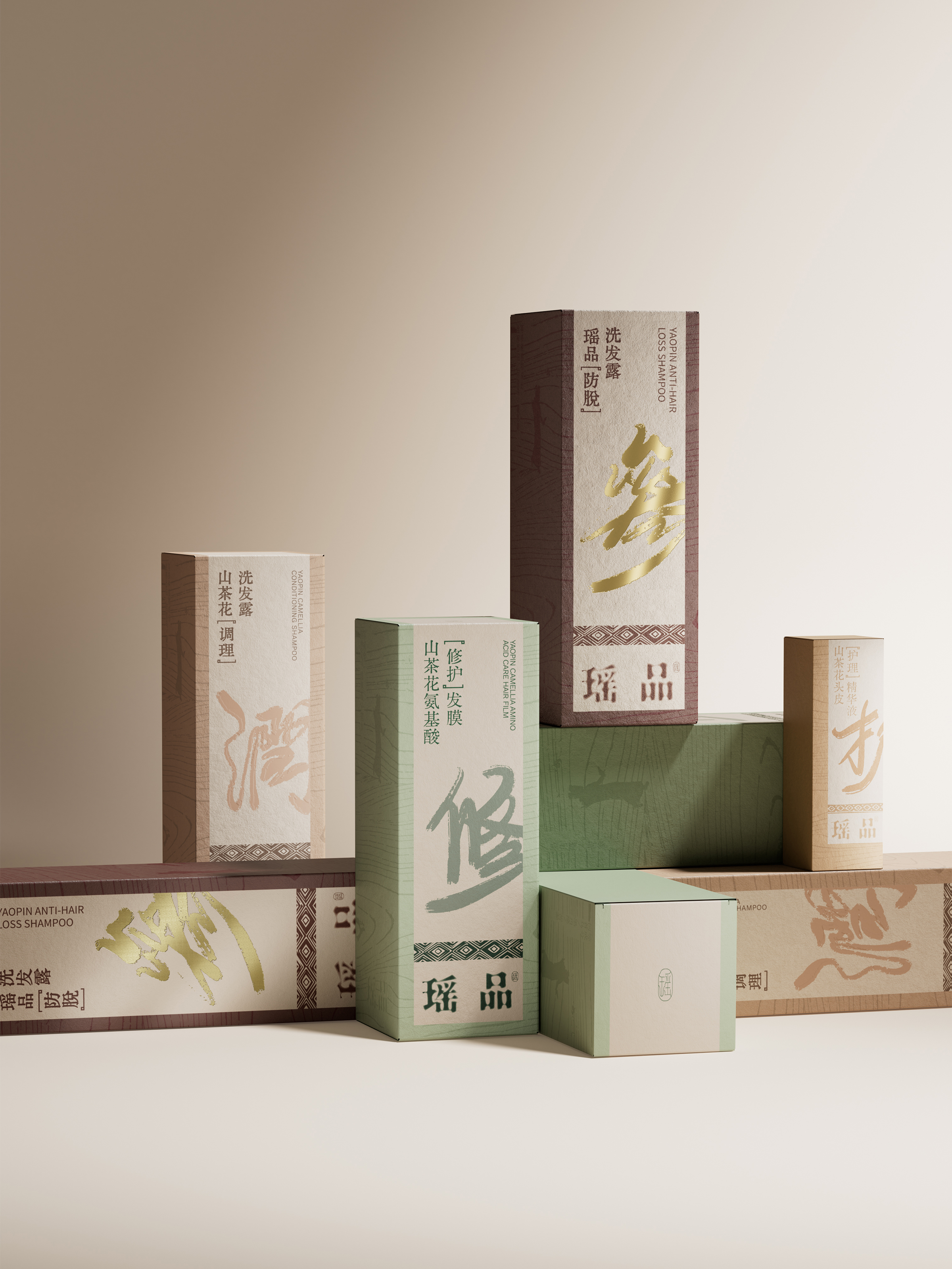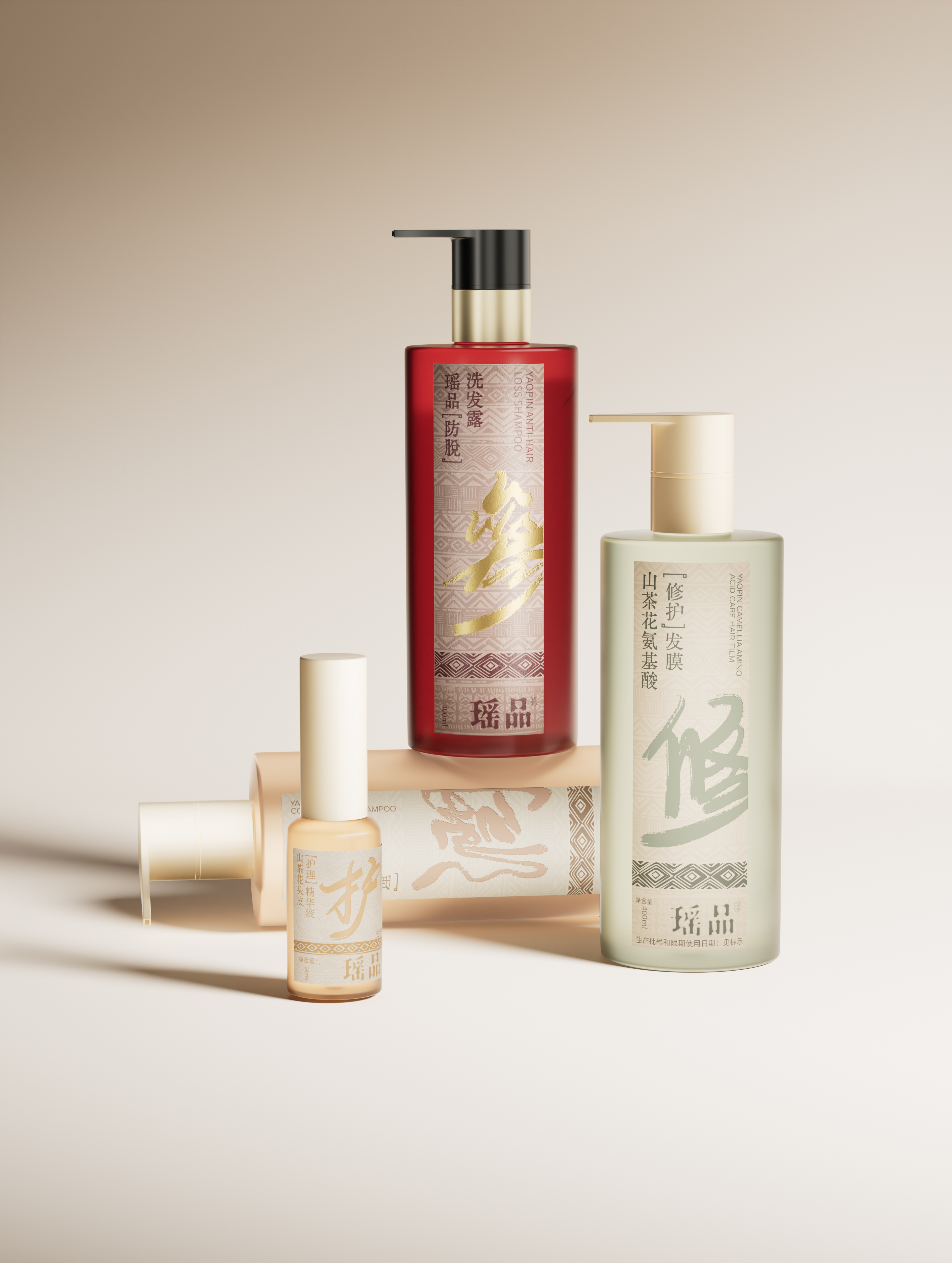 瑶品传承自从千年前流传至今嘅瑶族女子养发奥秘,利用天然嘅草本配方同埋浸药护发嘅谂法,嚟为消费者重塑头皮亚健康嘅状态。我哋响瑶族嘅民族特色同草本药方入面拎出祲古朴嘅韵味,再由设计师亲手写低嘅书法字体配合啲药材配色,嚟区分唔同嘅产品线,跟住提炼自得瑶綉先有嘅盘王组合纹路,夹埋响个瘦蜢瘦长嘅细面贴标,带畀消费者一股秀致又古雅嘅气息,同时亦都带畀市场一道嚟自大山瑶里嘅徐风。 YAOPIN inherits the mystery for hair care by the women of Yao nationality form thousands of years ago, using natural herbal formulas and medicinal bath hair care to reshape the sub-health state of the scalp for consumers. We have absorbed its ethnic characteristics and the ancient charm of herbal prescriptions, using handwritten calligraphy fonts and medicinal color schemes by designers to distinguish different product lines. Combined with composite graphics extracted from the unique combination pattern of the king Pan from Yao nationality embroidery, combined with long and small area labeling, we present consumers with a beautiful and elegant atmosphere, and also bring a gentle breeze from the Yao culture in the mountains to the market.