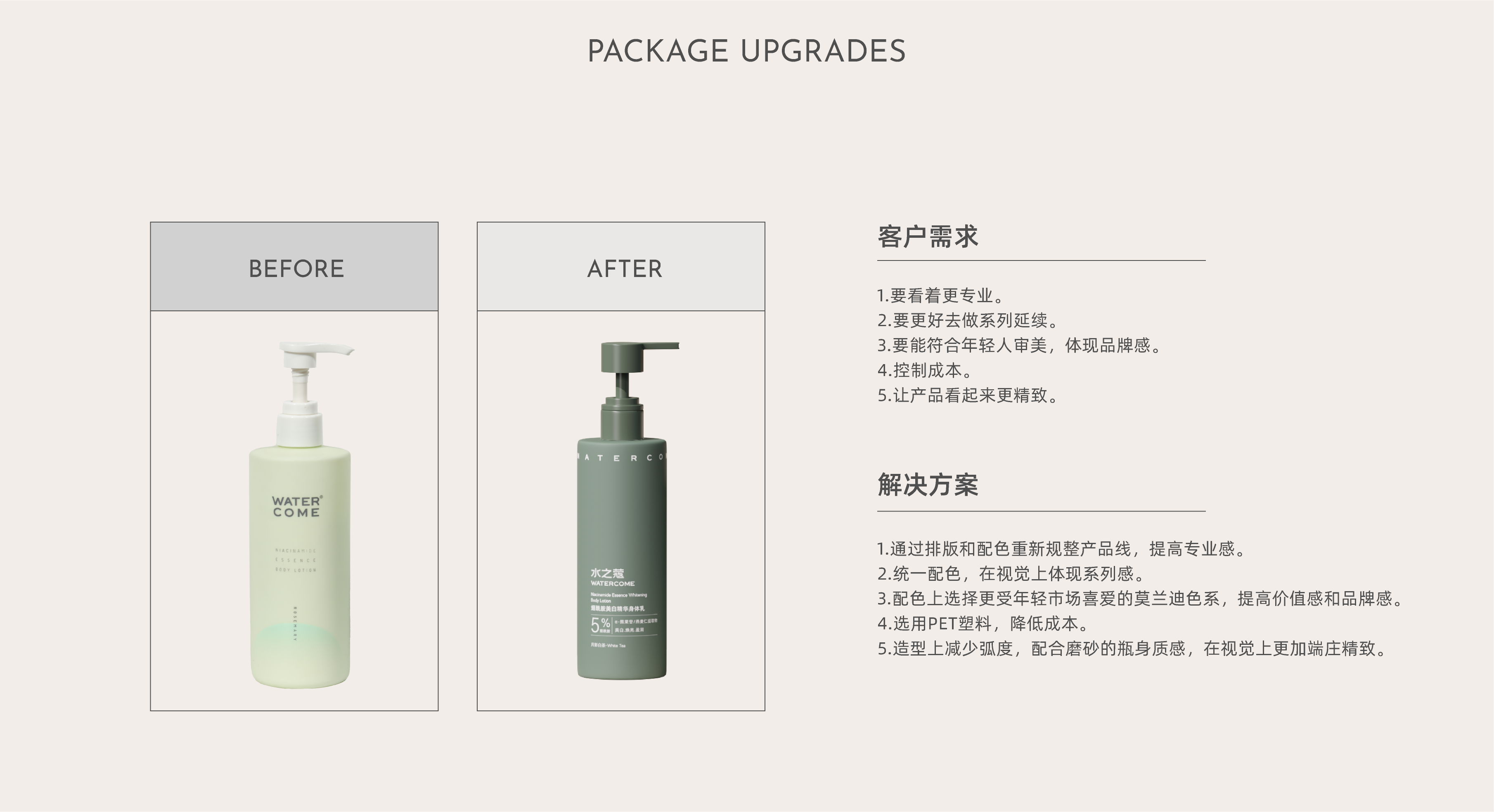 今次我哋帮水之蔻品牌进行咗系列性嘅包装升级同规划,一边配合品牌视觉,用莫兰迪色嚟统一成套配色,同时用更啱当下消费者锺意嘅英文排版嚟更新旧阵嘅设计,一边落力系多处工艺上嚟达到同普通产品嘅区分,企求带畀消费者优质嘅使用体验,同时摱高水之蔻嘅品牌感同价值感。 We upgraded the package design and the brand plan for WATERCOME, and we coordinating with the visual style of WATERCOME to consistency in Morandi color scheme and upgrading in the layout style which is more close to customer, we also strive to differentiate ourselves from ordinary products in terms of technology, aiming to provide consumers with a high-quality user experience while also enhancing the value of brand and value of worth for WATERCOME.