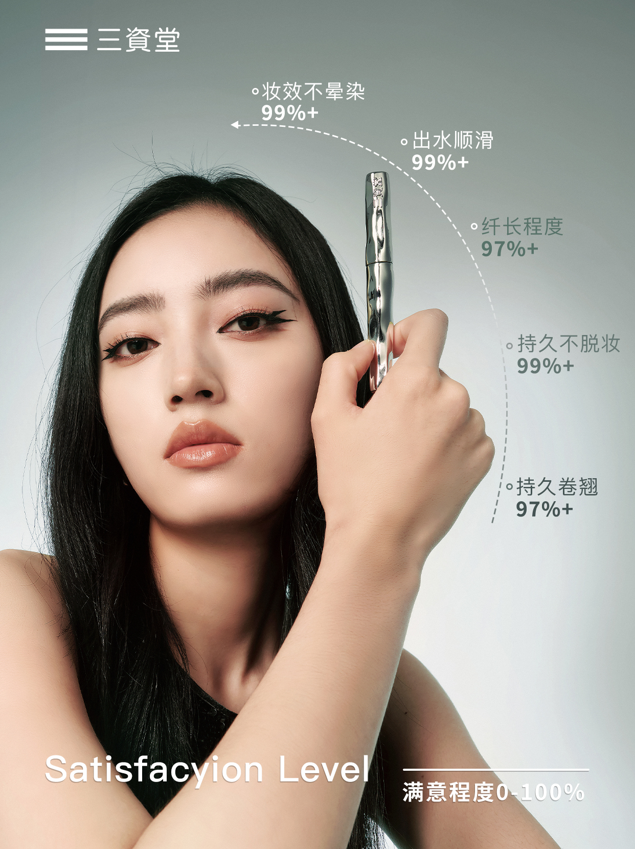 以理性工具助力感性表达,呢个喺三资堂嘅slogan,亦都喺我哋今次设计嘅出发点。 今次我哋嘅产品升级,喺跟实品牌“大胆和有趣”嘅要求,咁我哋设计卷翘睫毛膏嘅时候,从水波涟漪中摞灵感,整出副浪下浪下嘅笔身,咁我哋就将呢种水波元素搦出嚟抌入造型设计上,等握笔处啱好响个水波凹位,将实用性同埋美感相结合。 咁我哋就希望可以通过大胆嘅造型设计,嚟到赋予消费者更大胆同自信咁样去表达自我嘅勇气,栋起一个先锋且自信嘅品牌形象。 The slogan of Sanzitang is to use rational tools to assist emotional expression, which is also the starting point of our design. Our product upgrade this time adheres to the brand's requirements of "boldness and fun". We were inspired by the ripples of water and designed the body of Steel Tube Mascara such wavy. We extracted this water wave element and combined it with the modeling design, so that the pen grip just falls on the water wave depression, combining practicality and beauty. We hope to empower consumers with the courage to express themselves more boldly and confidently through bold styling design, and establish a pioneering and confident brand image.