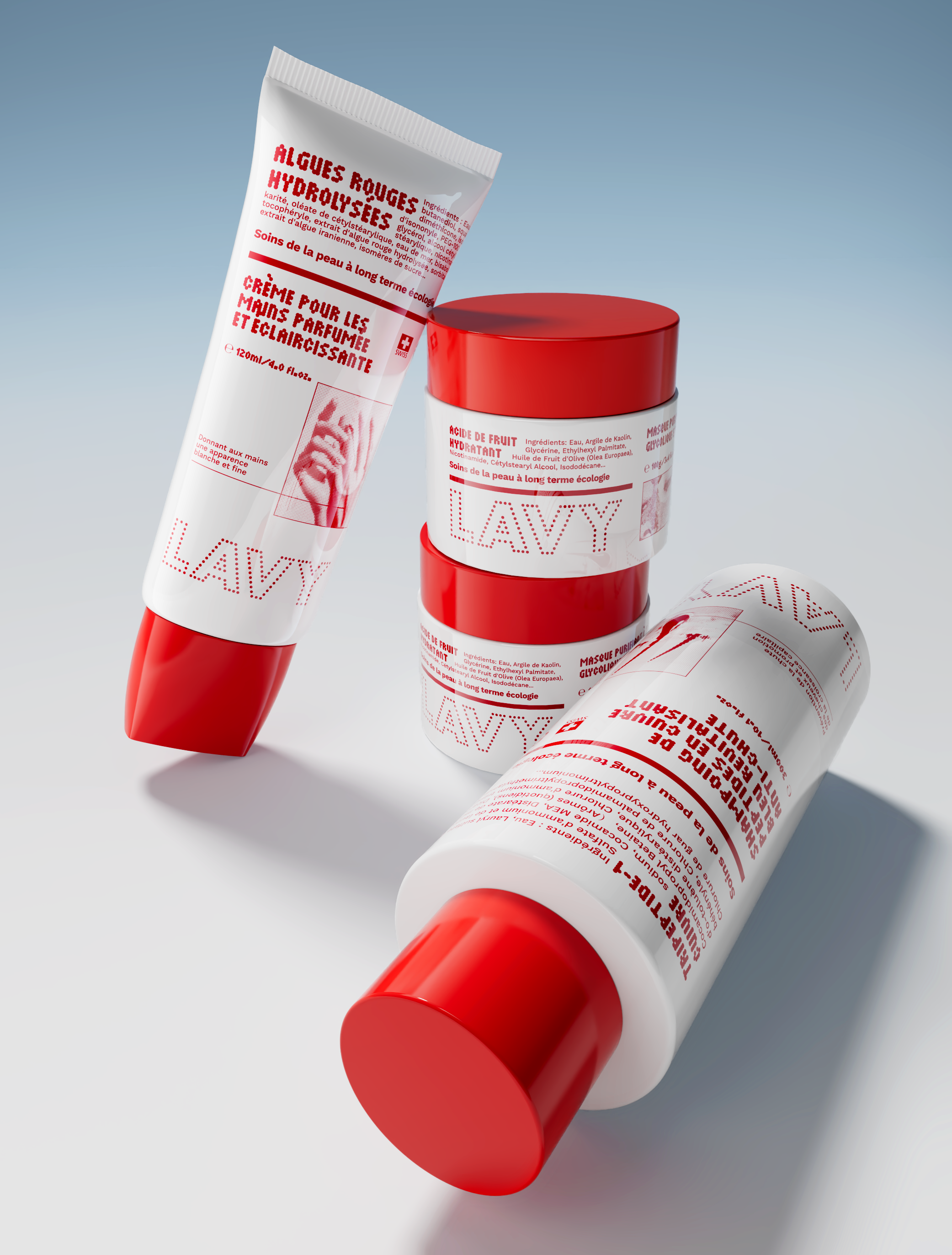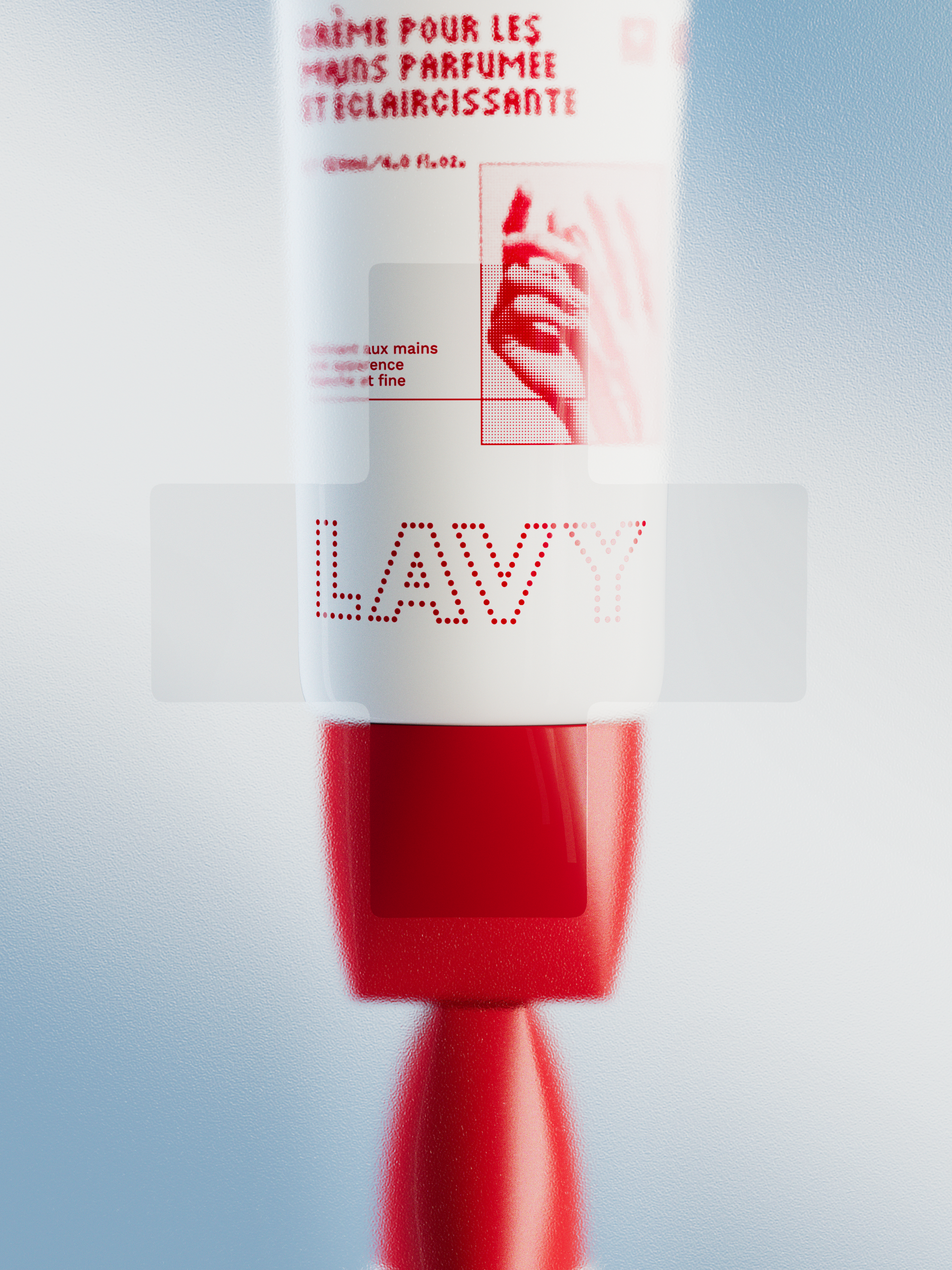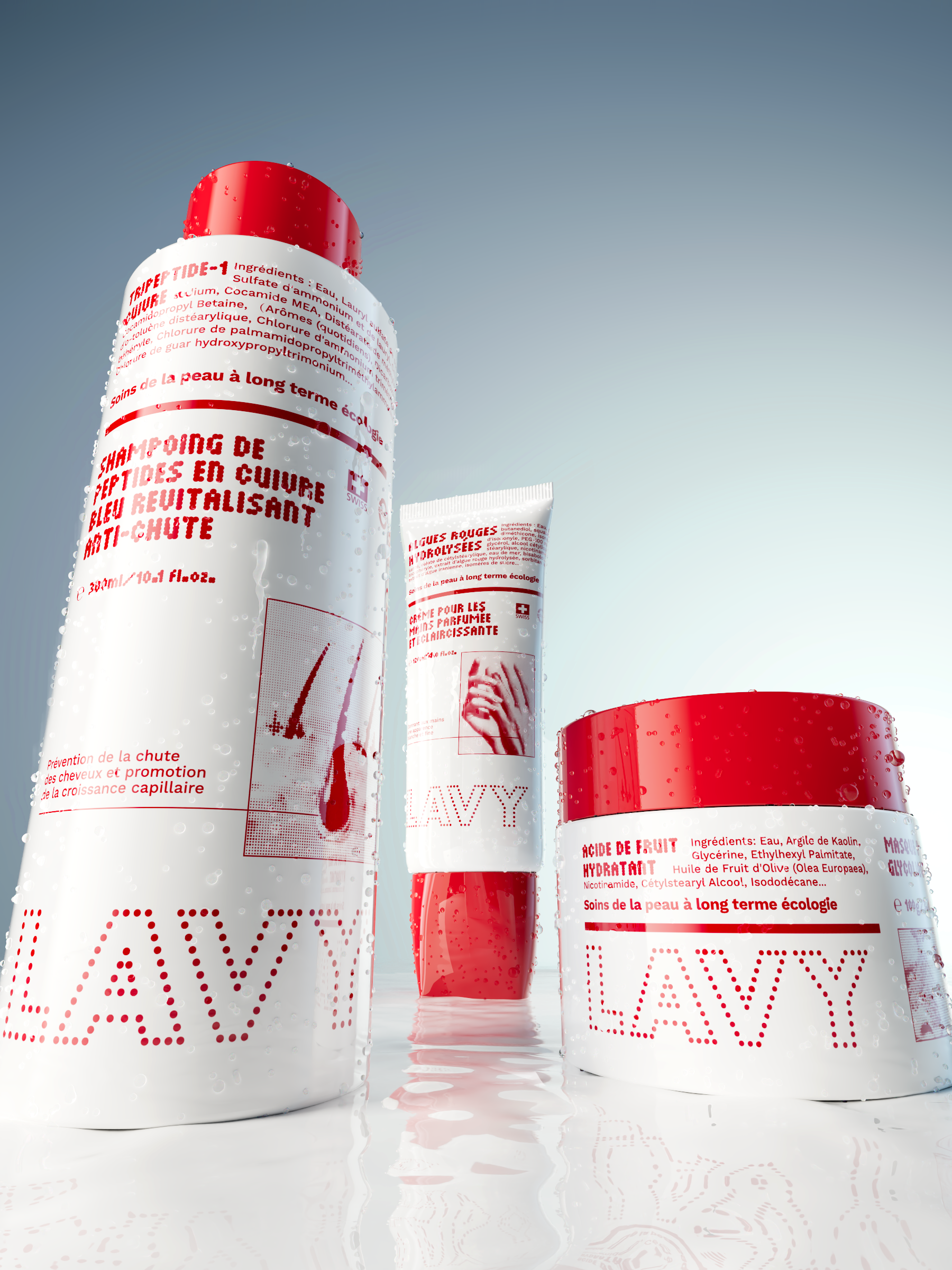 Lavy 萊威係一個誕生於瑞士嘅藥妝級個護品牌,透過極簡配色同設計突出品牌嘅專業度以及功效性。一個由紅色實驗性圓點為錨點嘅設計靈感元素,模擬喺顯微鏡下放大後嘅活性細胞分子,我哋希望透過微觀嘅觀察視角體現對消費者專業性同極致化嘅關注,提供安全、溫和、零添加嘅強功效型個護體驗,喺每款產品嘅視覺應用上,我哋將圓點概念延申至文字標誌及各類可視化概念圖,從每一個 “ 點 ” 嘅細微關注出發,將目標擴散至肌膚狀態嘅最終改善同解決過程,同時整套系列融入咗統一嘅視覺衝擊色,塑造品牌超高辨識度同強記憶性。 Lavy is a Swiss-born cosmeceutical personal care brand that emphasises professionalism and efficacy through minimalist colour schemes and design. The design inspiration centres on a red experimental dot, representing active cellular molecules magnified under a microscope. We aim to convey a professional and meticulous focus on consumers through a microscopic perspective, offering a safe, gentle, and additive-free personal care experience with powerful efficacy. We extend the dot concept to the visual application of textual logos and various visual concept diagrams in each product. Starting from the detail attention on every ‘dot,’ we expand the focus to the ultimate improvement and resolution of skin conditions. Meanwhile, the entire series incorporates a unified visual impact colour, establishing the brand's high recognisability and strong memorability.