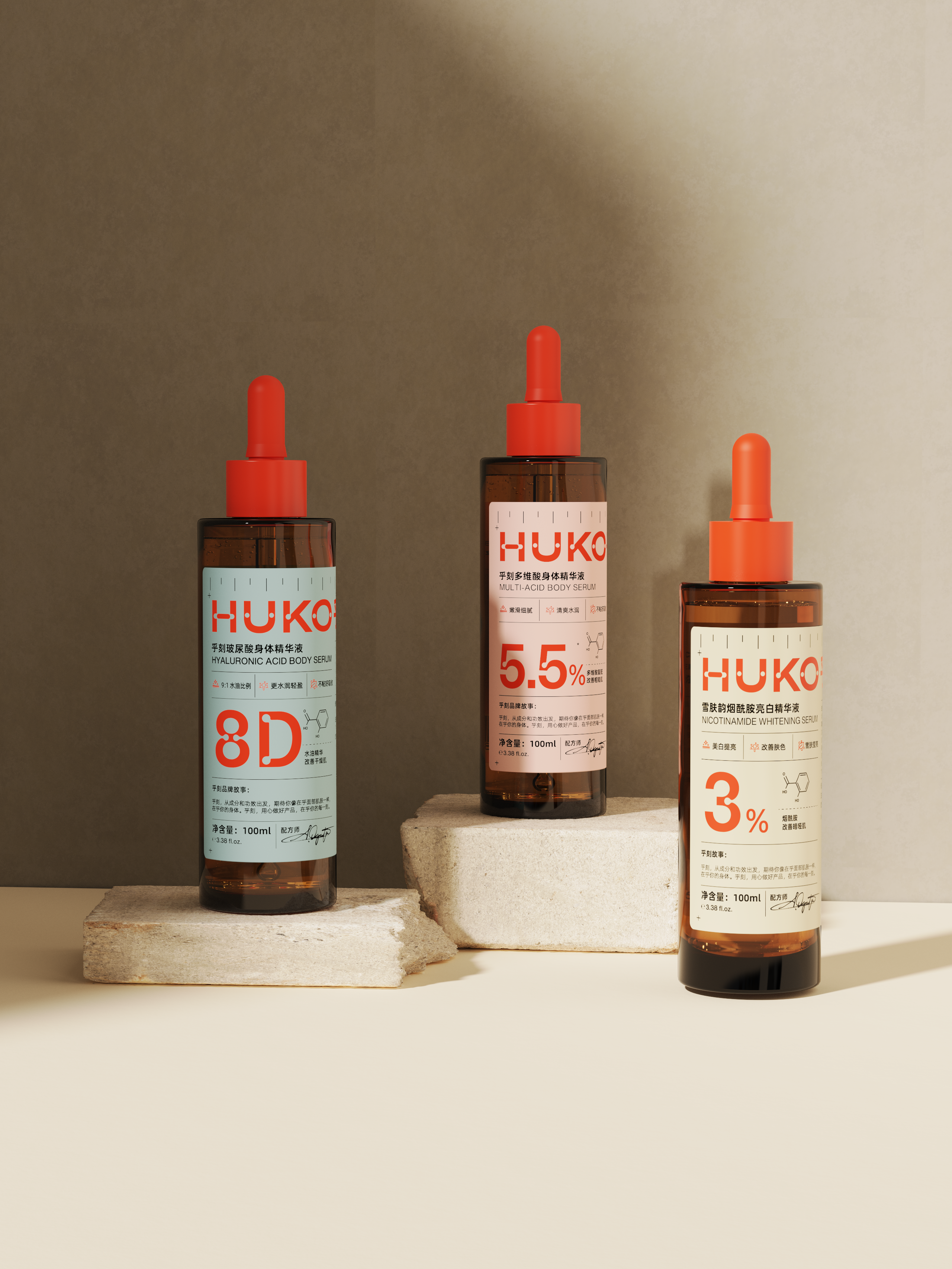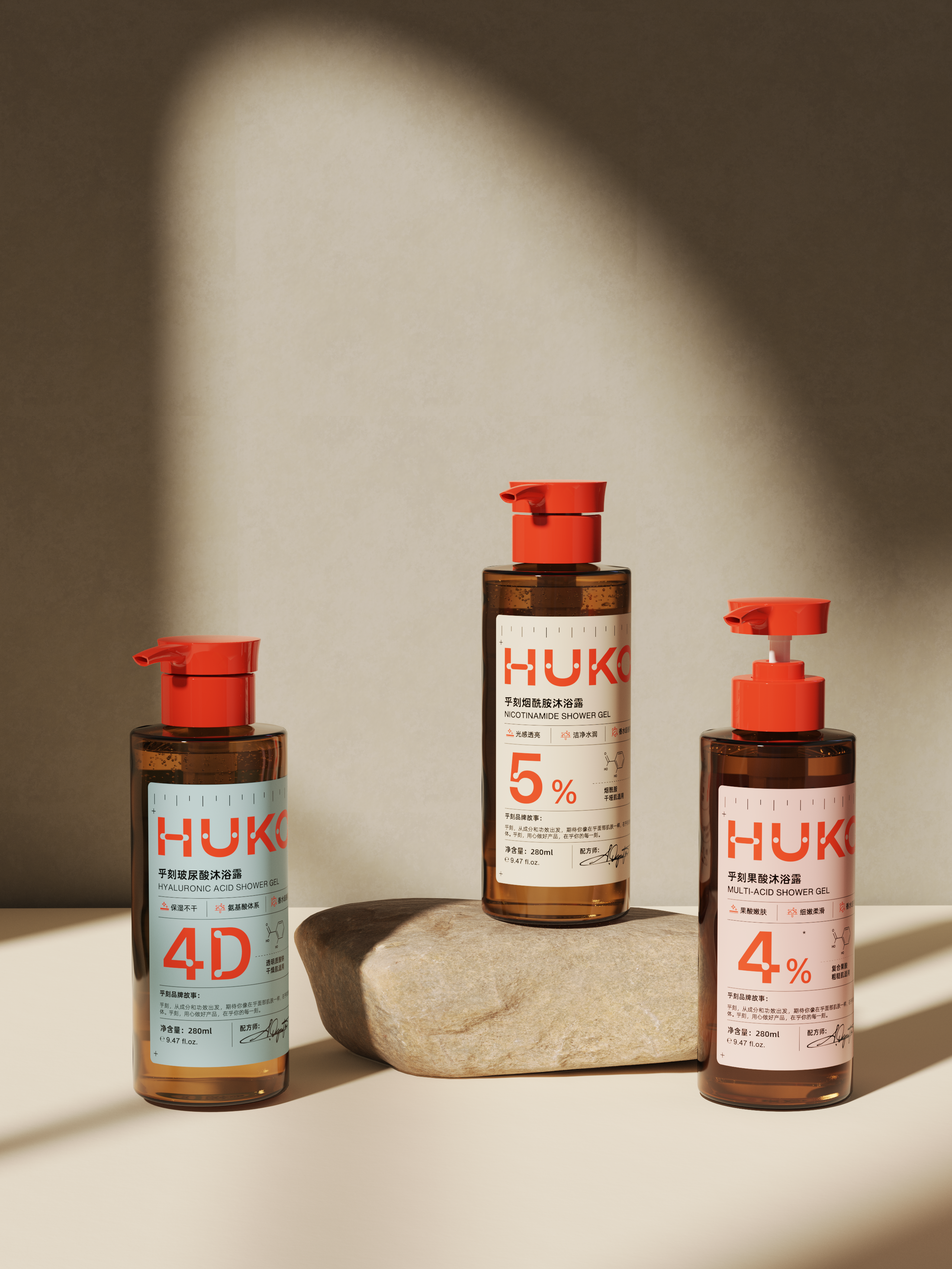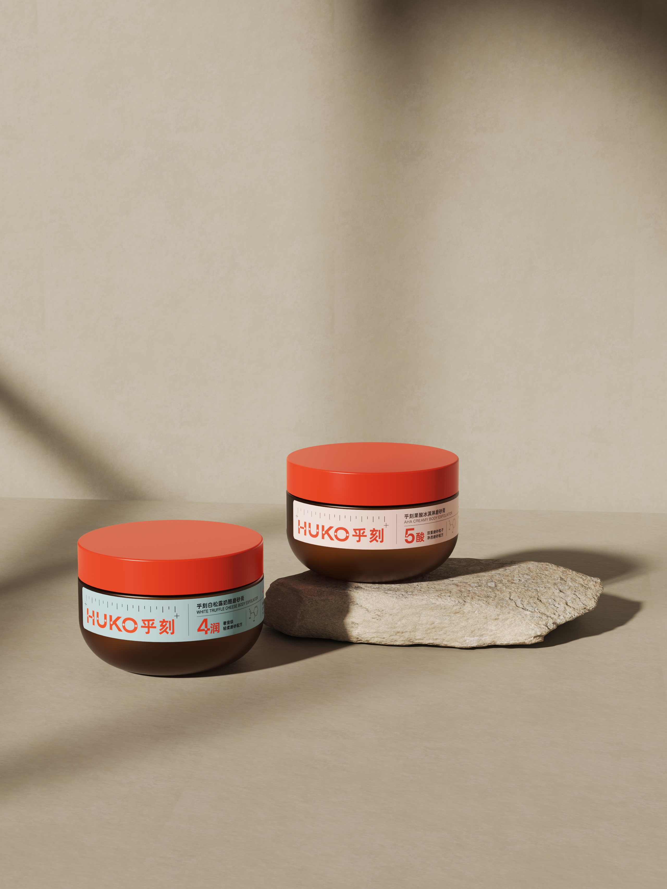 HUKO乎刻,在乎你嘅每一刻。 HUKO乎刻喺一个全新嘅精细化个护品牌,品牌着紧喺消费者嘅每一个细节位,希望创造出可以拆掂消费者每一个细节需求嘅产品。 卡尺上面嘅刻度表达嘅喺“每一刻”,谂住传递出品牌着紧消费者嘅每一刻,展现出品牌嘅理念同埋温度。 我哋嘅设计聚焦响品牌对自己专业度嘅自信,品牌对生物科技进化嘅过程从懵䒏䒏到熟头熟路嘅每步探索,以及对产品成分高精度比例嘅思考同埋科学搭配。 每款产品我哋都用咗充满专业同活力嘅品牌色嚟到搭配劲有品牌味嘅产品标贴。醒目嘅品牌色更擒得住消费者对眼,品牌独有嘅刻度元素定班出现,又可以加深消费者对品牌嘅记性,简短擘大嘅数字信息摆做主视觉焦点,更可以进一步里撩起消费者对产品嘅好奇,而添加化学符号标志就可以等产品更专业。 HUKO cares about every moment of you. HUKO is a bran-new refined personal care brand that cares about every detail of consumers and aims to create products that can meet every detail of consumers' needs. The scale on the caliper expresses "every moment" and conveys the brand's concern for consumers in every moment, reflecting the brand's philosophy and temperature. Focusing on the brand's confidence in its own professionalism, it discusses the brand's step-by-step exploration of the evolution process of biotechnology from ambiguity to clarity, as well as high-precision thinking and scientific matching of product ingredient ratios. Each product uses professional and vibrant brand colors paired with distinctive product labels. Distinctive brand colors are easier to capture consumers' attention. The unique scale elements of the brand are fixed and appear, deepening consumers' brand memory. Short and enlarged digital information serves as the main visual focus, attracting attention and further expanding consumers' curiosity about the product. Adding chemical symbols and logos makes the product more professional.